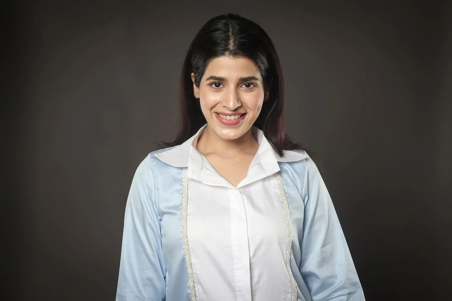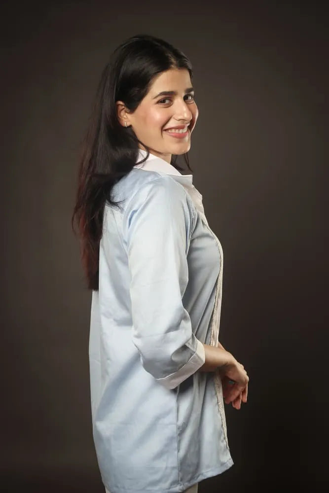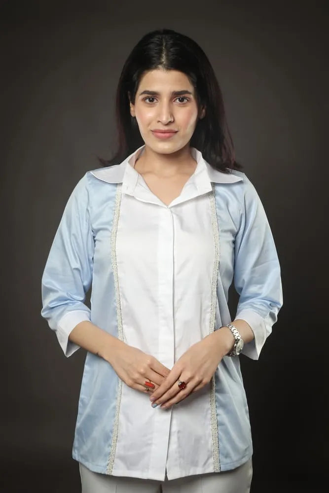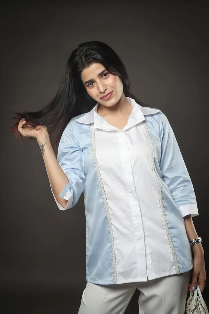 White and blue colour-block shirt with embellished lace detailing at the centreMaterial: Giza cottonPattern: White and blue colour blockNeck type: Point CollarSleeve: Three-fourth sleeve with cuffPocket: NALining: NA