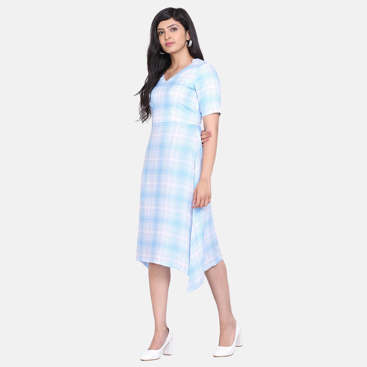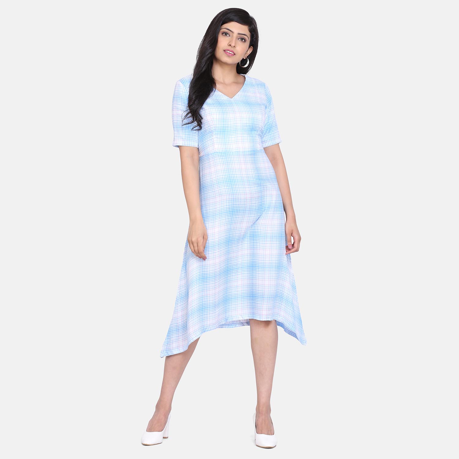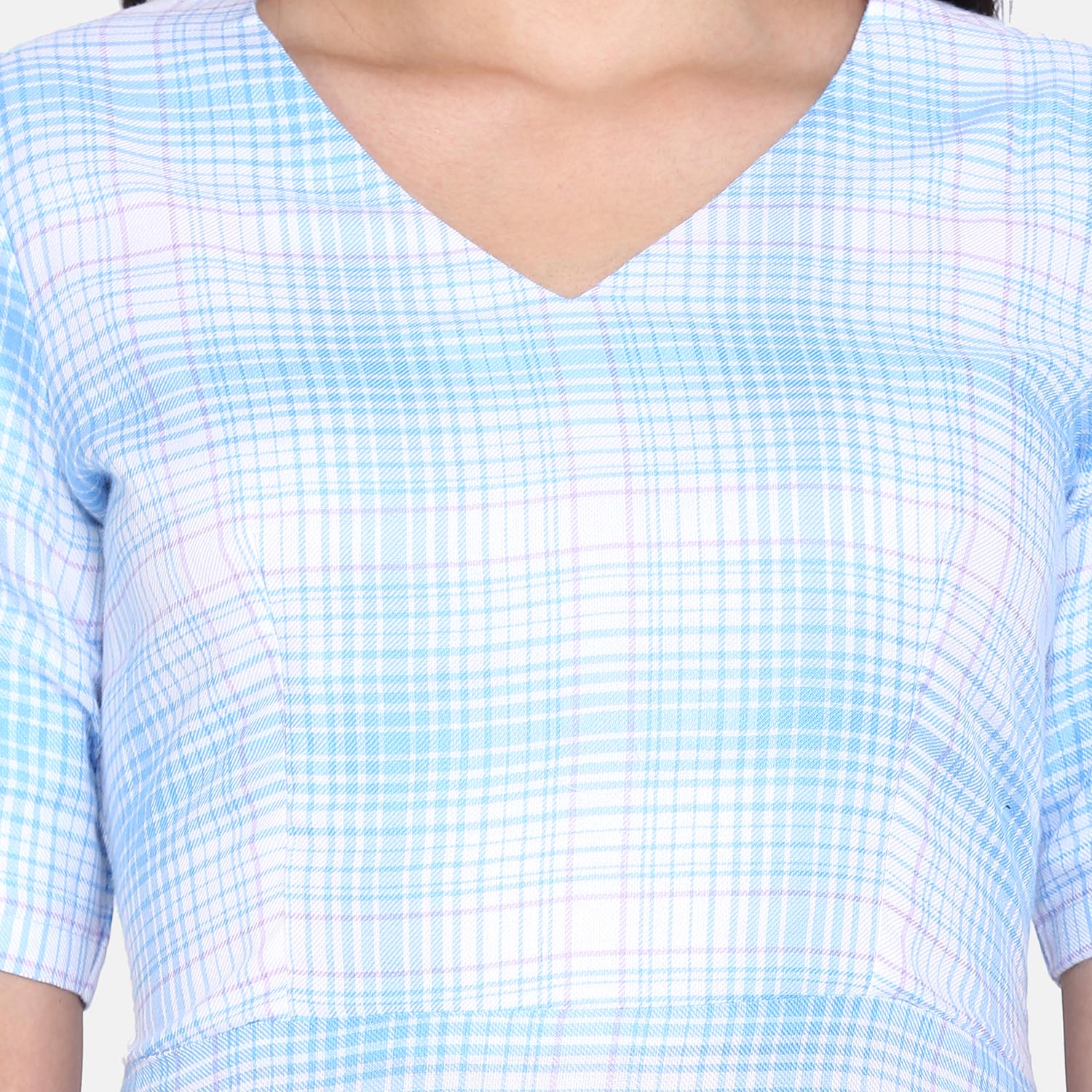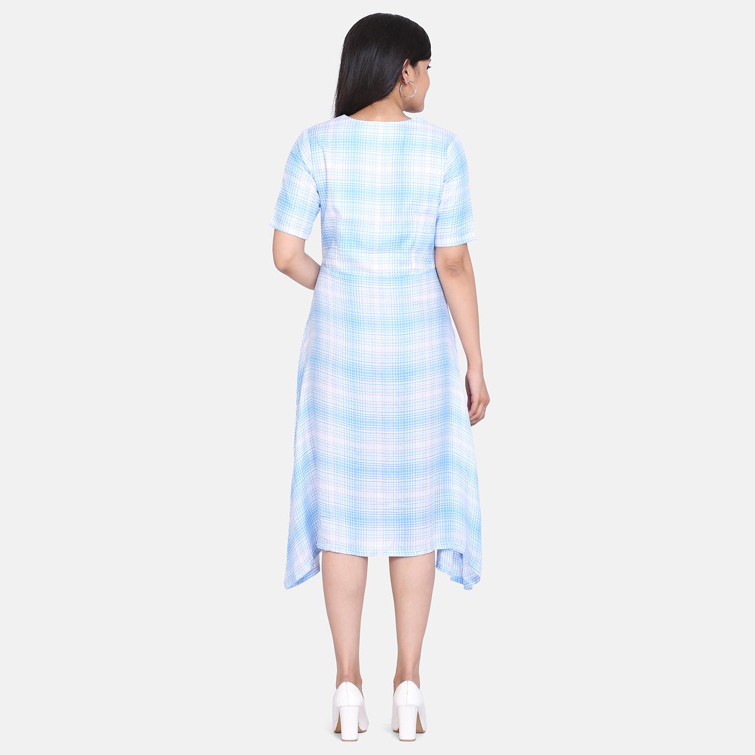 Sky Blue and white Checkered Rayon A Line Women's Dress
