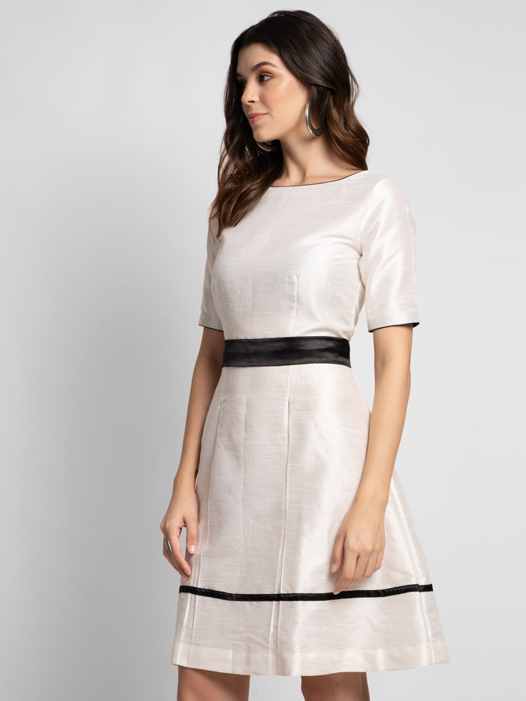 Look elegant and become a head turner with this simple yet classy Creamy White Skater Dress made in Poly Dupioni fabric and lined with Santoon fabric, which is soft to skin. It has Satin waist belt and Satin details at arms and hem.