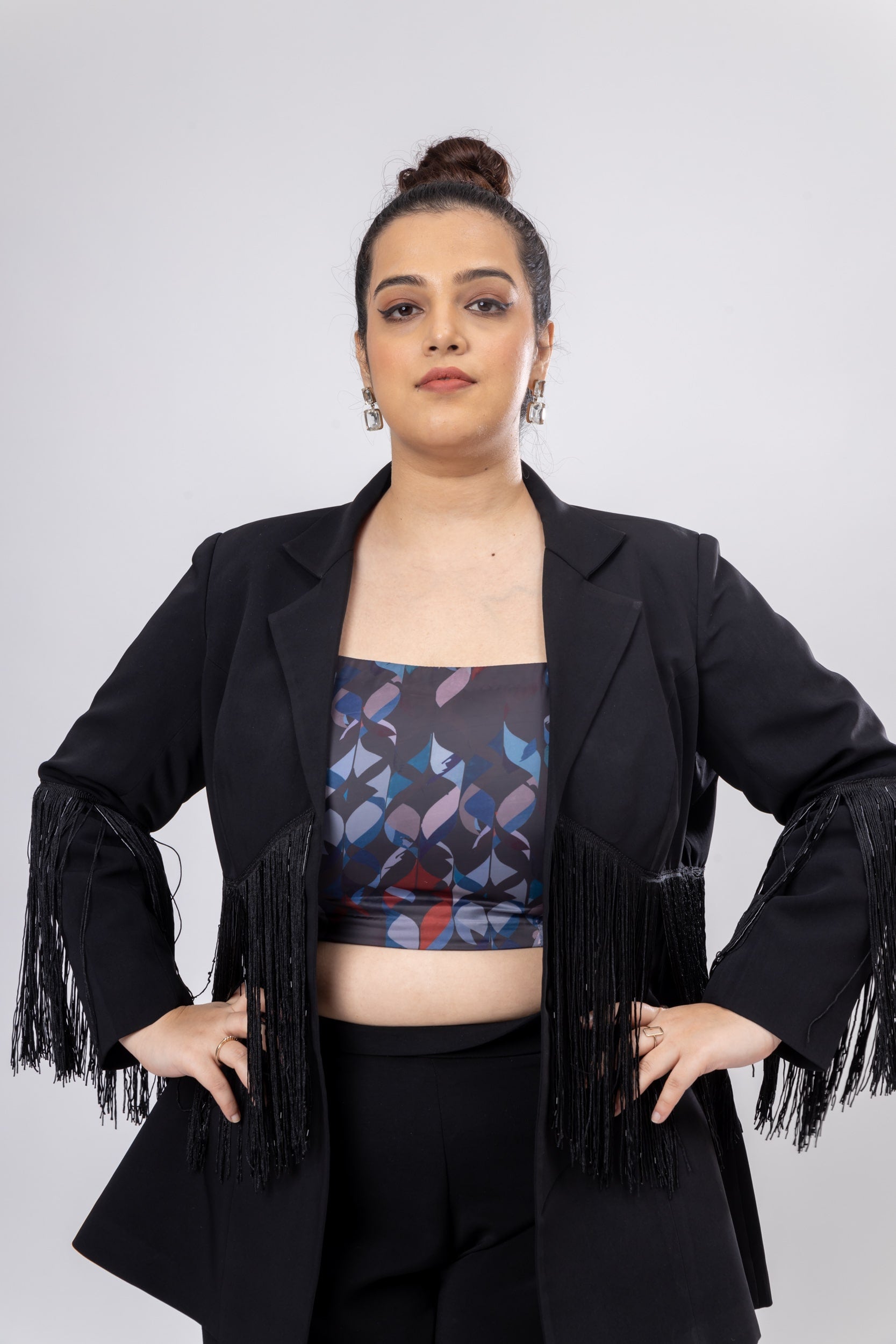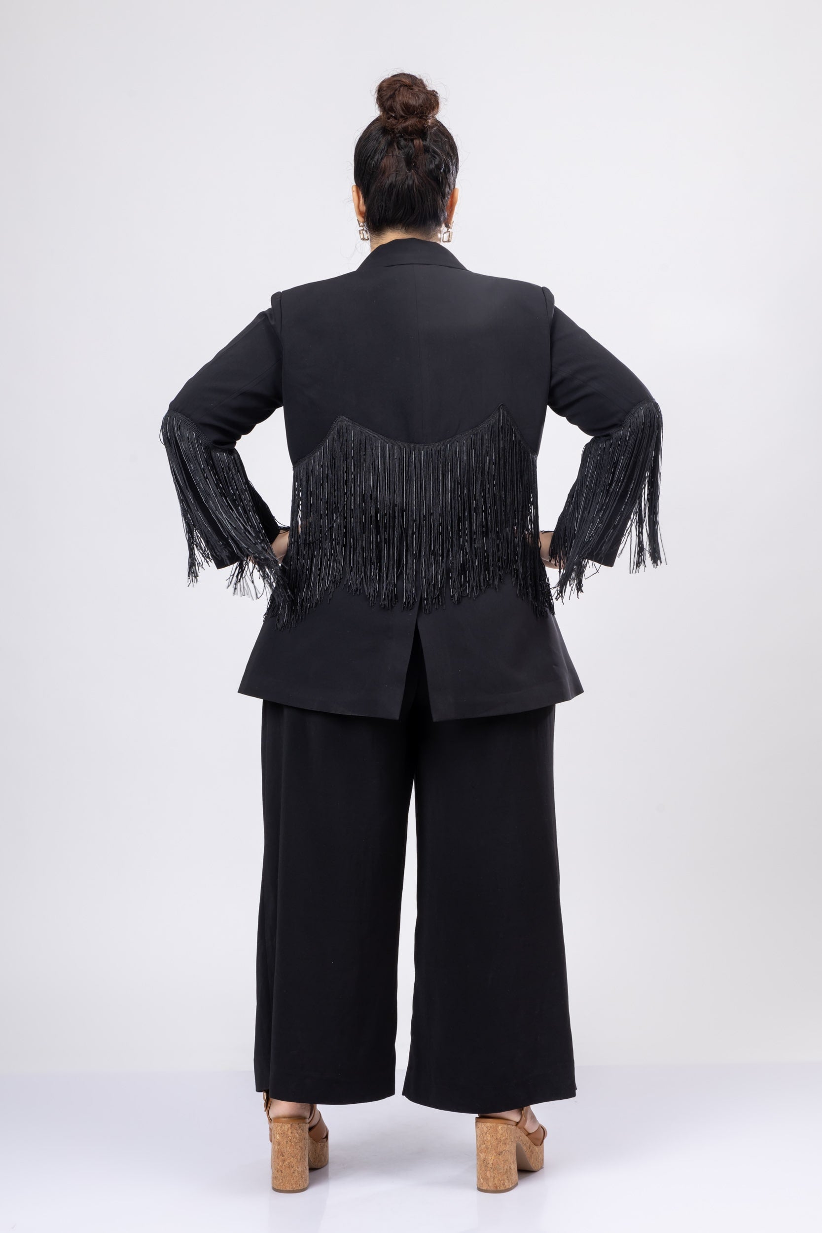 Ace the look with sophistication by adorning this Mid-Night Mist Fringe Jacket in Moroccan Crepe fabric. With a bold appeal of a tailored design, this jacket is emphasised by the classic lapel collar neckline. Additionally, the front button and back slit create a flattering silhouette. Material: Moroccan CrepeColour: BlackLength: Above...