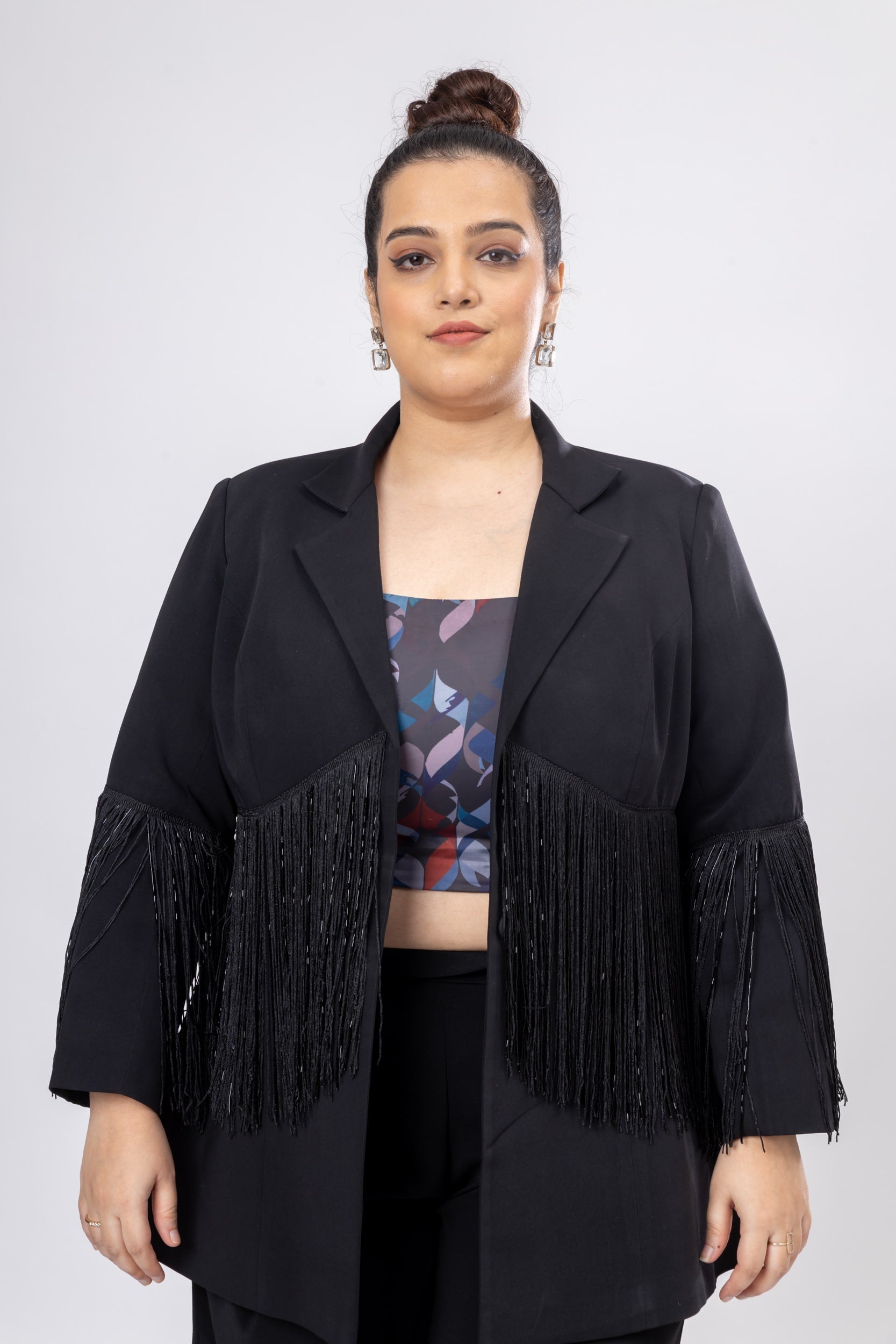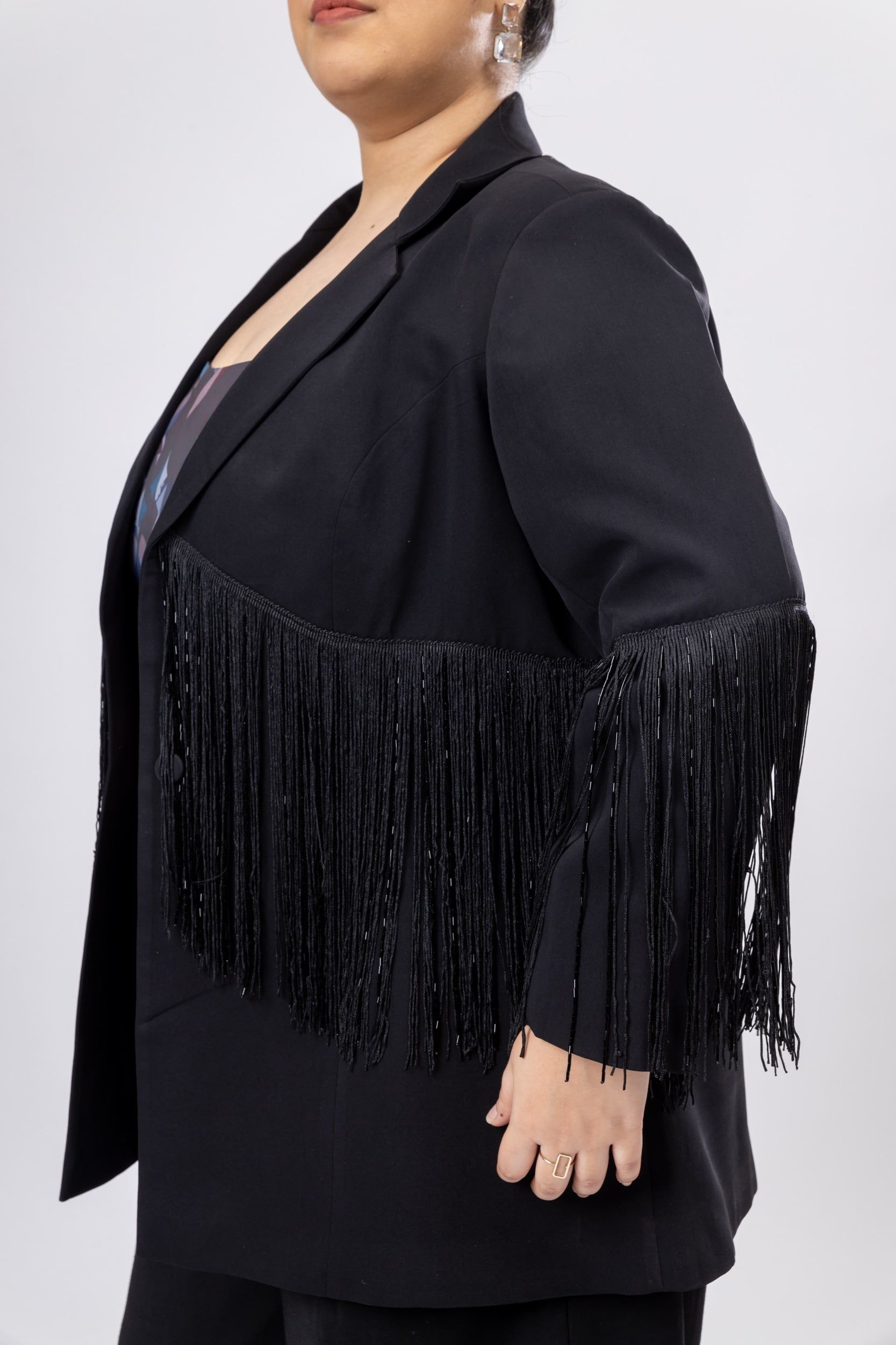 Ace the look with sophistication by adorning this Mid-Night Mist Fringe Jacket in Moroccan Crepe fabric. With a bold appeal of a tailored design, this jacket is emphasised by the classic lapel collar neckline. Additionally, the front button and back slit create a flattering silhouette.