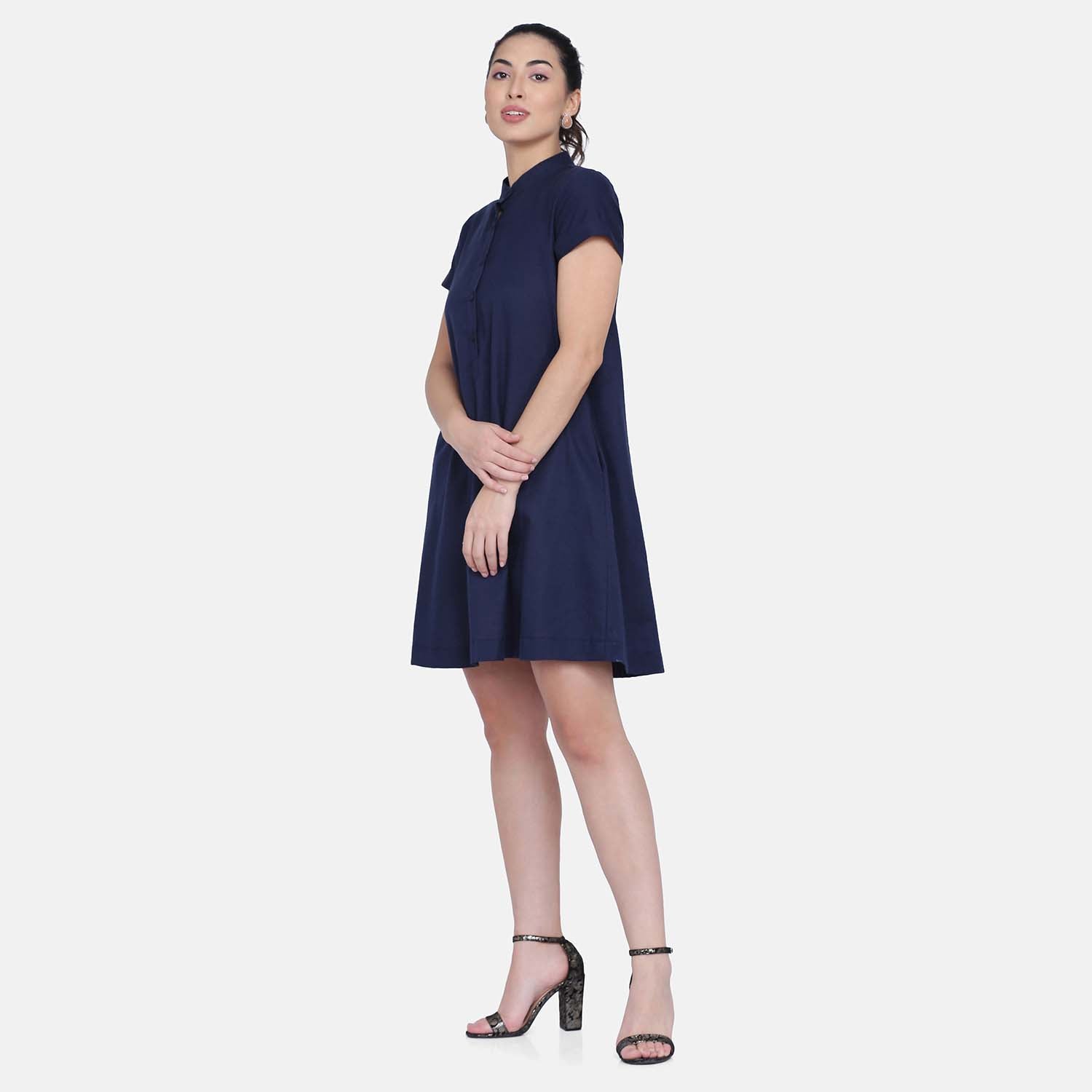 Wear this comfy relaxed fit Navy Blue sundress with mandarin collar and button down placket. It has short cuffed sleeves and relaxed fit and is perfect for those sunny days. Material: Cotton Colour: Blue Neck: Mandarin Collar Neck Sleeves: Short sleeves Details: Placket with button closure till waist Wash care:...